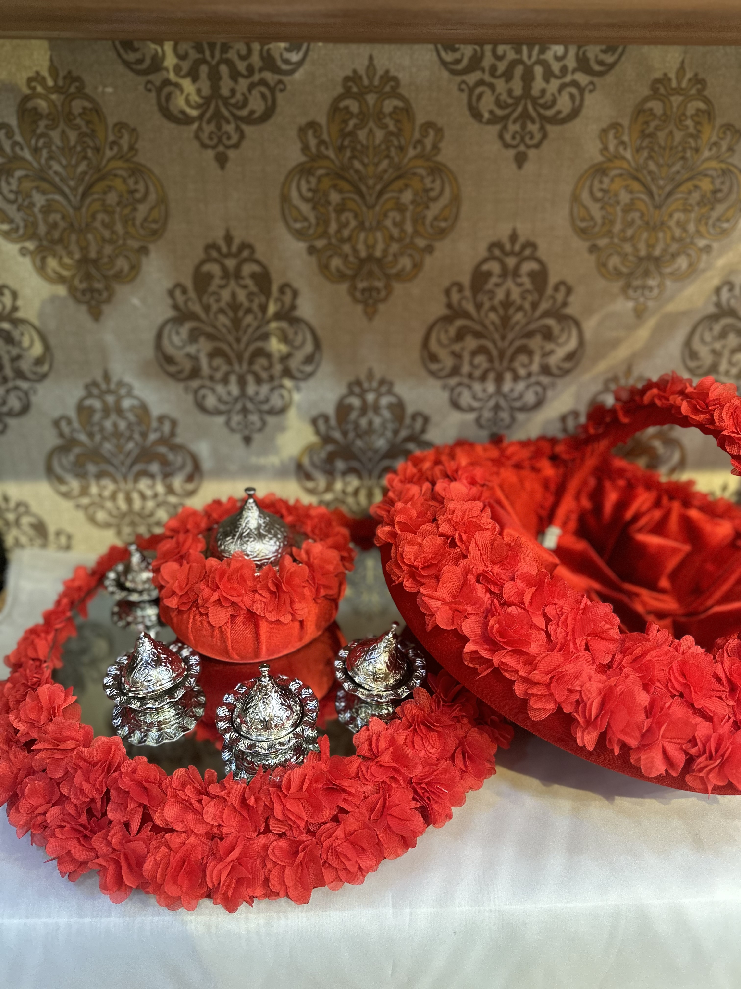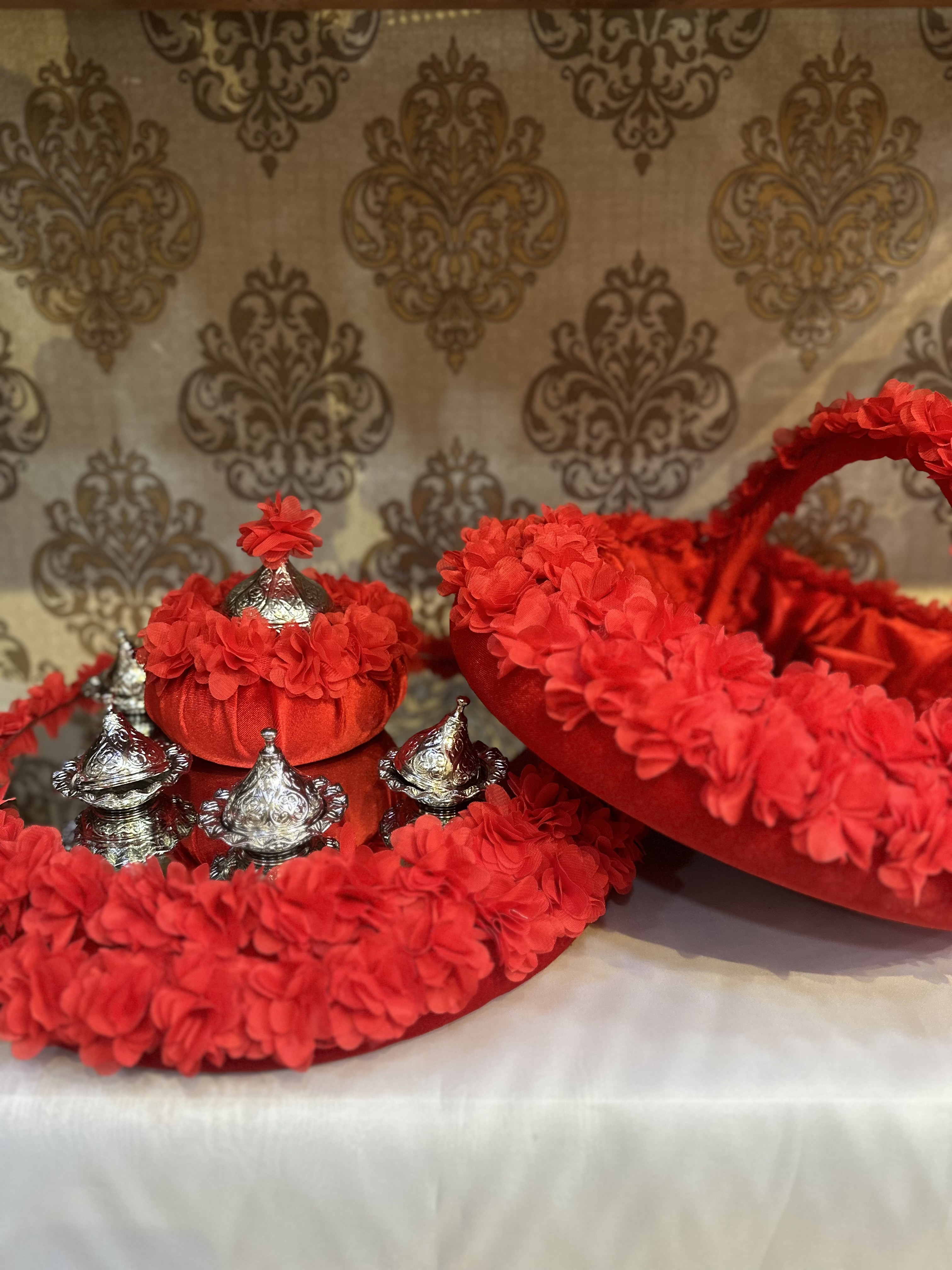 LAZER CİCEK SUSLEME SEPET TEPSİ SETİ&AKSESUARLARI(4 ADET LOKUMLUK +1 ADET ŞEKERLİK)