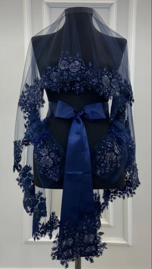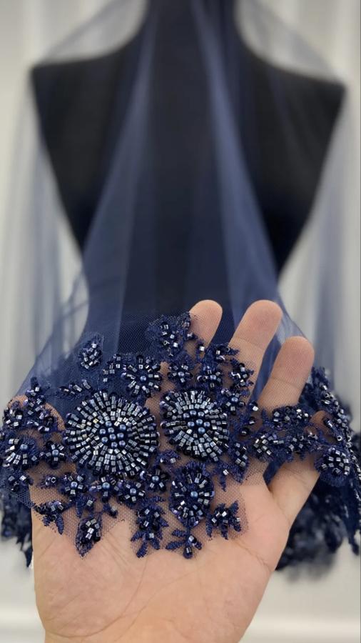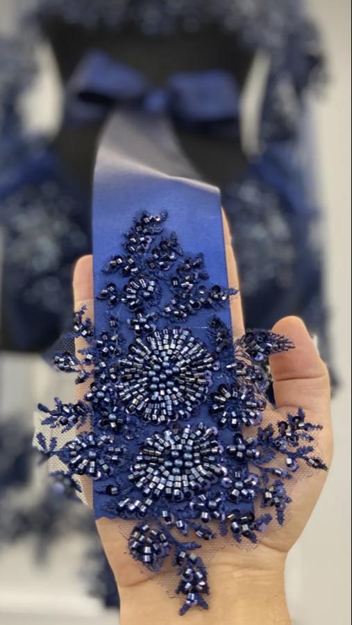 LACİVERT İNCE KENAR TAŞ BONCUK İŞLEMELİ DUVAK KUŞAK ELDİVEN İKİ EL GULU SETTİR